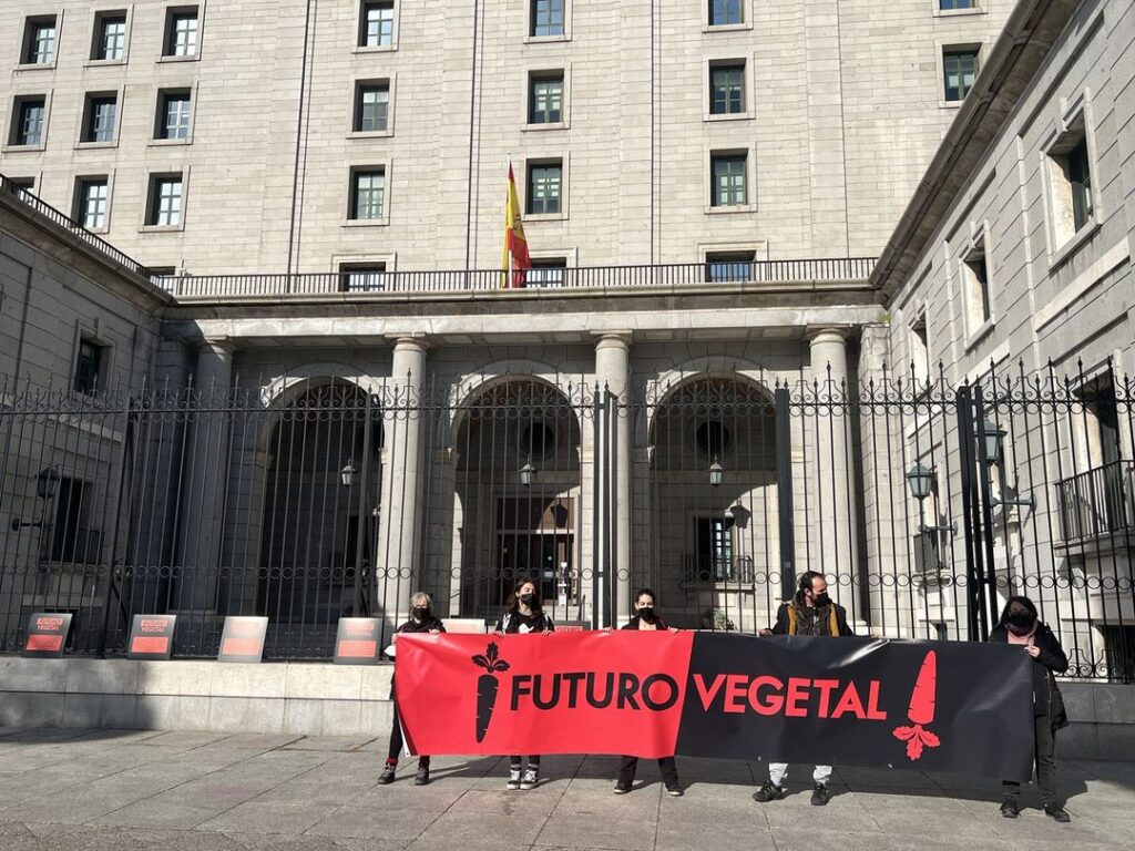 Con la consigna “Teresa Ribera mata callando: el ecocidio de la ganadería”, activistas de Futuro Vegetal han condenado el silencio de la Ministra en la polémica desatada sobre las macrogranjas. Los ciudadanos señalan que, según Naciones Unidas, la industria ganadera es la principal responsable de emisión de gases de efecto invernadero a nivel global.