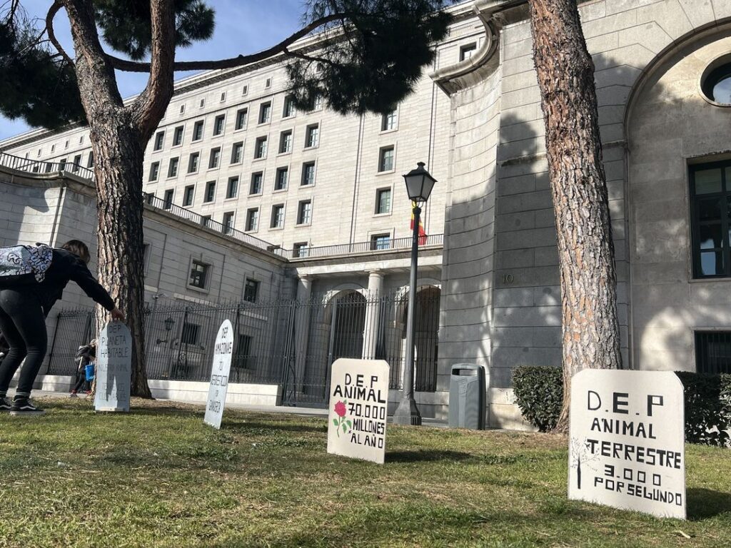 Las activistas han escenificado el desastre que conlleva la ganadería con mensajes como “DEP animales”, “DEP Amazonas”, “DEP océanos”, “DEP agua potable” y “DEP planeta habitable”, acompañados de cifras de estos acontecimientos, colocando lápidas en los jardines del Ministerio de Transición Ecológica y Reto Demográfico.