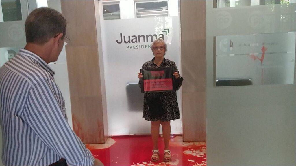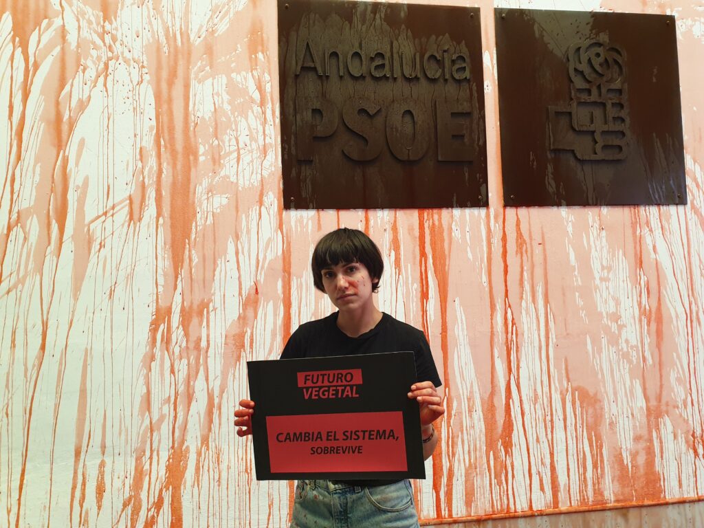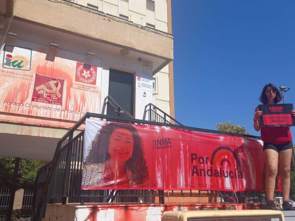 Como protesta por la falta de debate público durante la campaña electoral sobre la soberanía alimentaria y su relación con la Crisis Climática en la región más afectada de la Unión Europea hemos lanzado pintura roja biodegradable en las sedes andaluzas del PP, VOX, PSOE e IU.