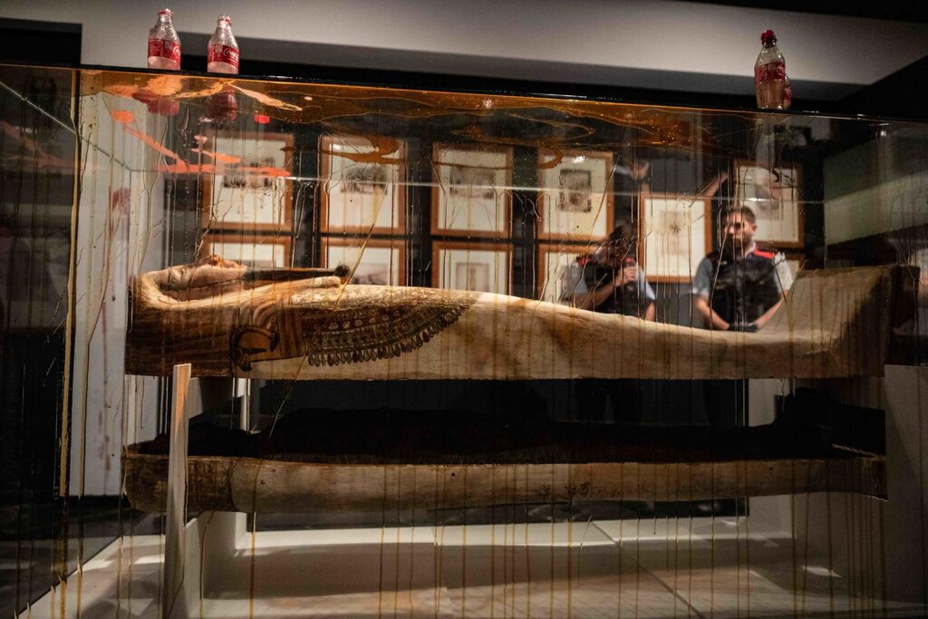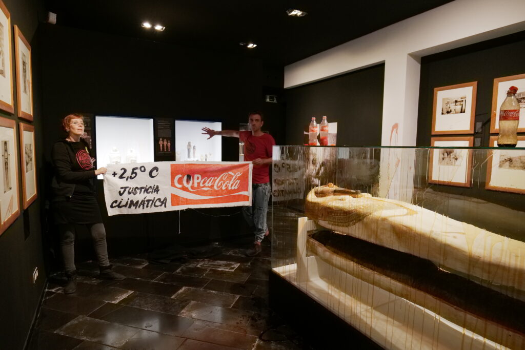 Esta mañana, dos militantes de Futuro Vegetal han bañado con “petróleo” falso la vitrina de una réplica de momia faraónica y rociado la pared con “sangre” falsa en el Museo Egipcio de Barcelona en señal de protesta por la emergencia climática. Acto seguido, se han pegado a las vitrinas cercanas y han desplegado una pancarta con el mensaje: “COPCA COLA +2.5º”, haciendo referencia, por un lado, a la 27ª Conferencia de las Partes de la Convención Marco de las Naciones Unidas sobre el Cambio Climático (COP27) que está tiendo lugar en Egipto, patrocinada por la multinacional CocaCola, corporación señalada como la mayor contribuidora mundial a la contaminación por plásticos (Break Free From Plastic Repport), y, por otro, a la subida de temperatura mundial que provocará un clima inestable y graves consecuencias en todo el planeta.
