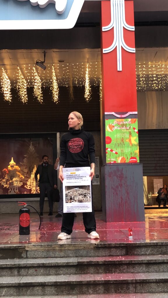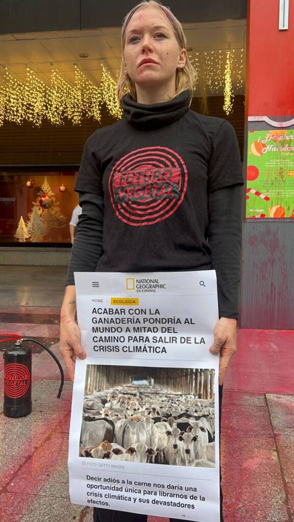“La ciencia nos asegura que acabar con la industria ganadera es una parte fundamental para mitigar la crisis climática y El Corte Inglés sigue promocionando su consumo mientras financia organizaciones negacionistas de la Crisis Climática” aseguró un militante de Futuro Vegetal.