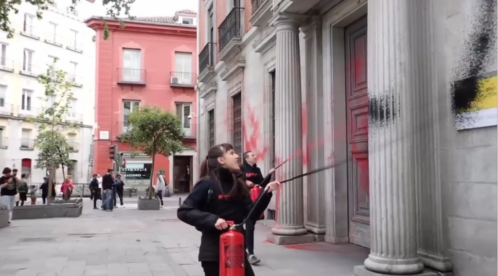 Militantes de Futuro Vegetal han teñido una sucursal madrileña del banco Caixabank de rojo y negro usando extintores, mientras recordaban a las presentes que el poder de las corporaciones “está en nuestra obediencia y el nuestro, precisamente, en desobedecer”. La protesta forma parte de la campaña de desobediencia civil no violenta de alta intensidad que el colectivo lleva sosteniendo desde hace más de un año y que está experimentando un punto álgido este mes de abril.