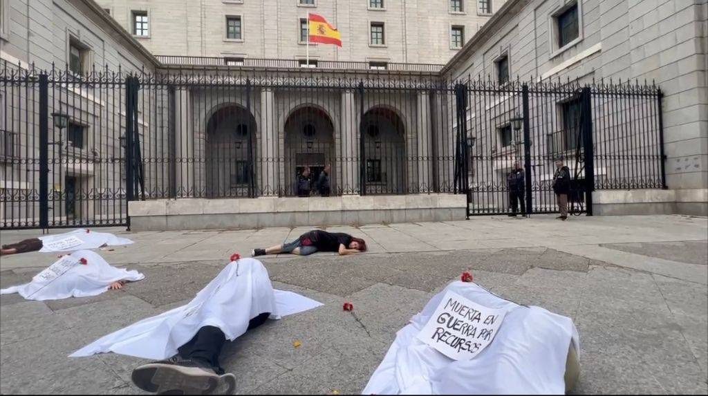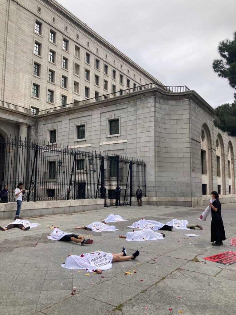 A las 6 de la tarde, 8 militantes del colectivo Futuro vegetal han escenificado su muerte a las puertas del Ministerio para la transición ecológica y el reto demográfico, portando carteles en los que se podía leer “Muerte en guerra por recursos”, “Me asesinaron para robar mi cosecha” y “Muerte en un episodio de inundación”. Desde el colectivo quieren señalar la incompetencia del Ministerio a la hora de abordar con contundencia la mitigación y adaptación al Cambio Climático. “Necesitamos que el ejecutivo proteja a la ciudanía del colapso ecosocial; las medidas impuestas hasta ahora no están reduciendo las emisiones, sino que en 2022 estas aumentaron un 9% en el Estado español”, apuntaba su portavoz.