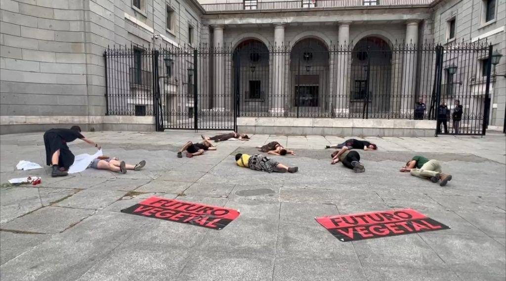 Esta performance se enmarca en la campaña de desobediencia civil que Futuro Vegetal lleva realizando a lo largo de este mes de abril, durante la cual han realizado cortes de carretera y rociado de pintura edificios oficiales, sucursales bancarias y las sedes centrales de los partidos PP y PSOE. Su demanda: desviar las subvenciones de la ganadería hacia la promoción de alternativas basadas en plantas sostenibles y socialmente justas. El colectivo ha recibido duros ataques por sus últimas acciones, pero mantienen su postura: “Estamos viviendo una sequía que ya hoy está poniendo en jaque gran número de cosechas a lo largo del territorio. ¿Se supone que tenemos que quedarnos de brazos cruzados ante la perspectiva de enfrentarnos al hambre y sed en un futuro próximo? Es inconcebible.”, concluyen.