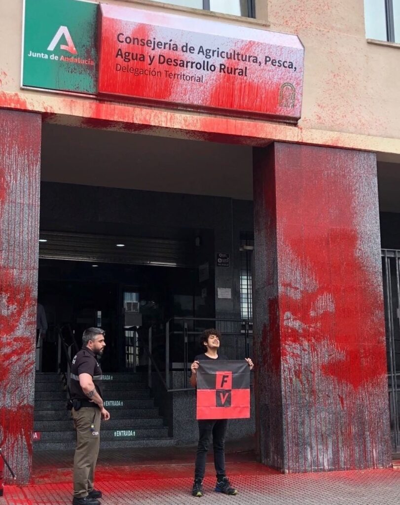 Esta mañana una activista de Futuro Vegetal ha rociado la fachada de un Burger King de la calle Dr Lluch de Valencia con pintura roja biodegradable, haciendo uso de un extintor. De esta manera quiere exponer la responsabilidad de las grandes corporaciones como Burger King, Mc Donalds o KFC en la Crisis Climática y en la sobreexplotación de recursos. La portavoz expresaba que “estas cadenas de comida rápida son responsables de la desforestación de la Amazonia, ya que se abastecen de productos como la carne de vacuno o la soja. Esta selva tropical se está talando y quemando para dar paso a los pastos y cultivos para alimentar el ganado, impulsando el Cambio Climático”.